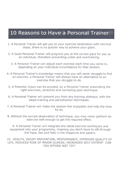 Just the other day, I came across a flyer at my gym: ’10 Reasons to have a Personal Trainer’.